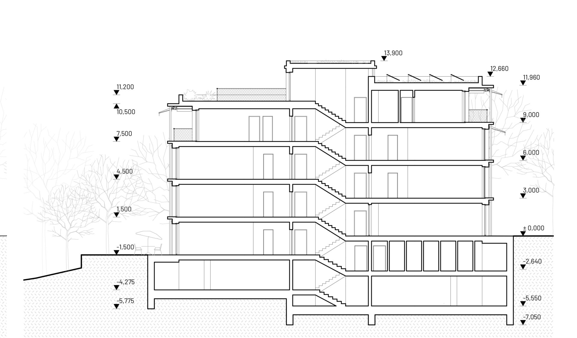 The new building — a lightweight wooden pavilion — is located within the garden at the northwest corner of the site. Its geometry and position respond to the surrounding development. The building mass, harmoniously placed into the sloping terrain, is conceptually based on a split-level system. Thanks to the layout and subtle façade proportions, it appears appropriately scaled and welcoming. The 28-unit floor plan is based on a principle of corner orientation towards the surrounding greenery, creating a soft interface between interior and exterior: interior — loggia/balcony — exterior.
